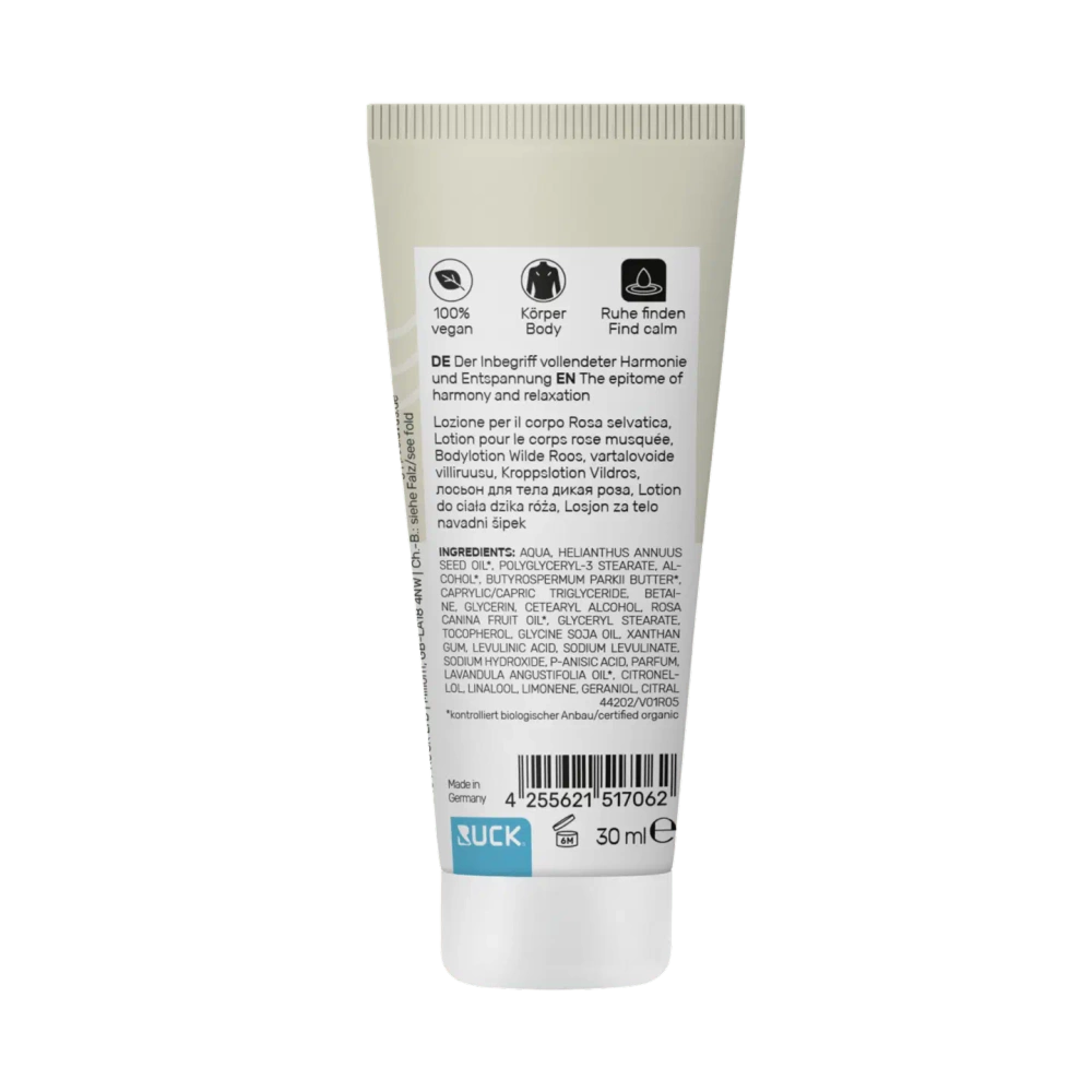 Ten bardzo szybko wchłaniający się lotion działa uspokajająco na ciało i umysł. Jest uosobieniem pełnej harmonii i relaksu. BIO olej z dzikiej róży wspomaga regenerację Twojej skóry. Wraz z nawilżająco działającym BIO masłem Shea i naturalną witaminą E reguluje zawartość wilgoci i czyni ją aksamitną. Cudny zapach.