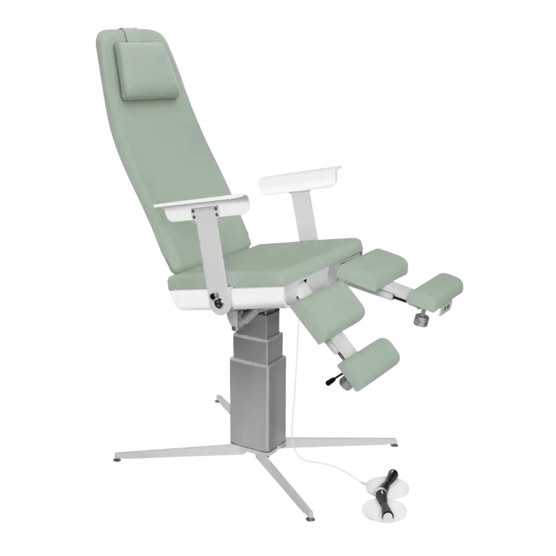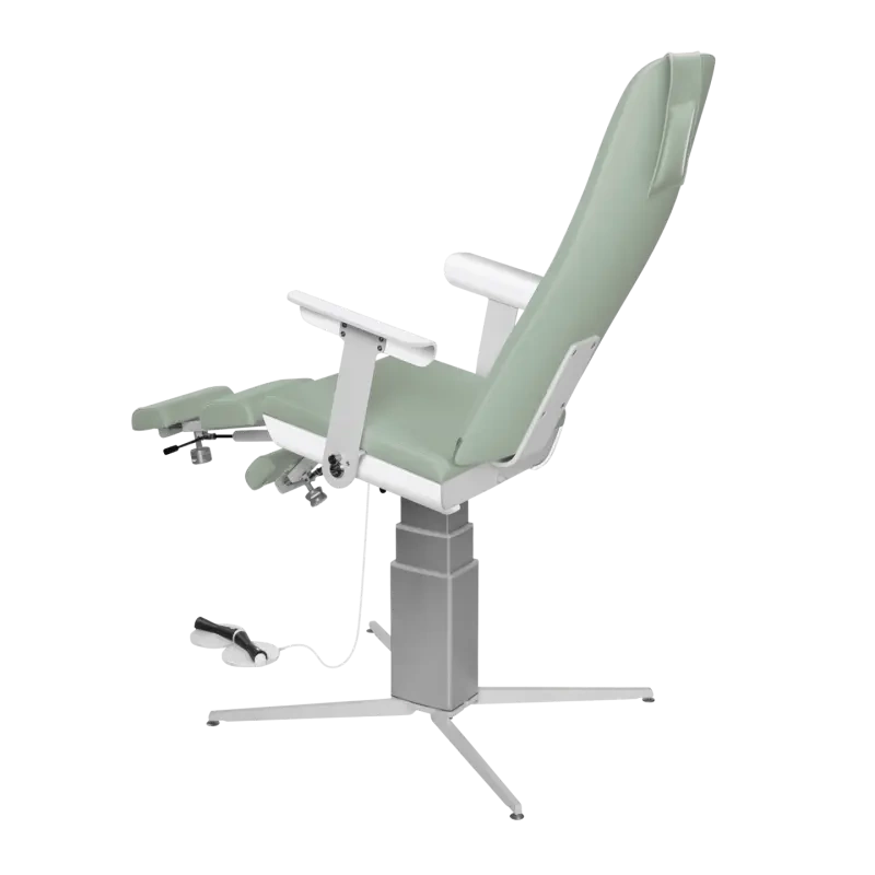 - Fotel do pielęgnacji stóp RUCK® SINA z elektrycznym podnośnikiem, regulacją podnóżka za pomocą siłownika gazowego i składanych podłokietników.