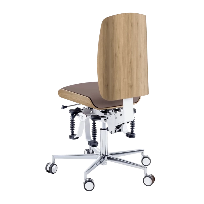 - Krzesło wyposażone jest w specjalne wahadła, które stabilnie poruszają się wraz z siedzącym człowiekiem. Te minimalne ruchy aktywują poszczególne mięśnie kręgosłupa chroniąc go przed bólem i skrzywieniem. Gimnastyka mięśni kręgosłupa efektywnie przyczynia się do ich wzmocnienia. Wpływa również na dłuższą wytrzymałość w pozycji siedzącej.