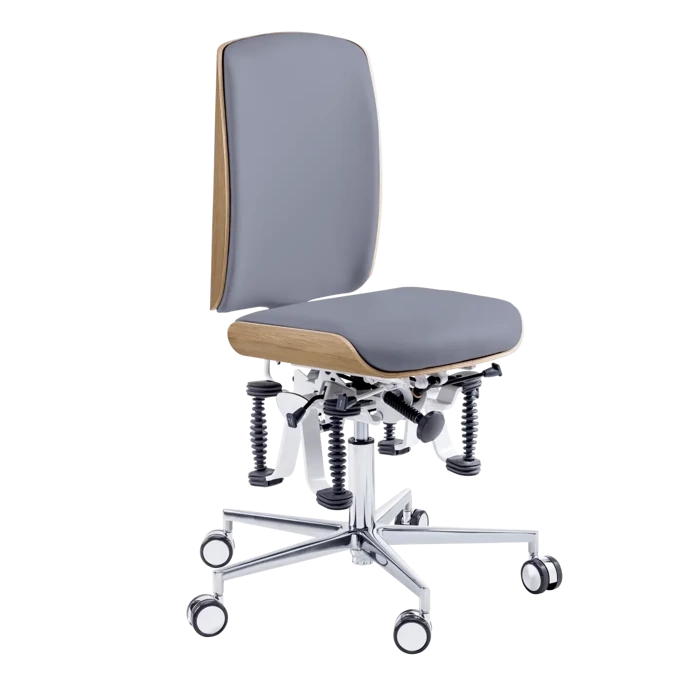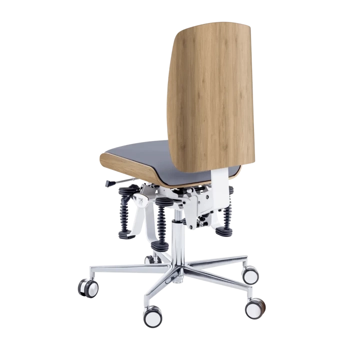- Krzesło wyposażone jest w specjalne wahadła, które stabilnie poruszają się wraz z siedzącym człowiekiem. Te minimalne ruchy aktywują poszczególne mięśnie kręgosłupa chroniąc go przed bólem i skrzywieniem. Gimnastyka mięśni kręgosłupa efektywnie przyczynia się do ich wzmocnienia. Wpływa również na dłuższą wytrzymałość w pozycji siedzącej.
