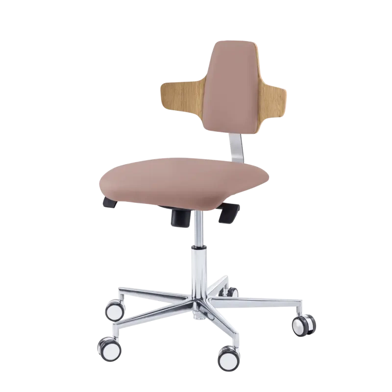 Klasyczne krzesło do pracy z indywidualnie regulowanym i blokowanym oparciem jest wyposażone w solidną aluminiową podstawę i samohamowne kółka. Element oparcia ma kształt kapelusza napoleońskiego, połączonego z tapicerowaną częścią środkową. Skrzydła fotela są idealne do oparcia ramion i odciążenia pleców. Wysokiej jakości formowane drewno jest pokryte odporną na uderzenia i środki dezynfekujące powłoką CPL. Krzesło jest dostarczane jako zestaw. Dostępne z krótkim lub długim podnośnikiem gazowym.