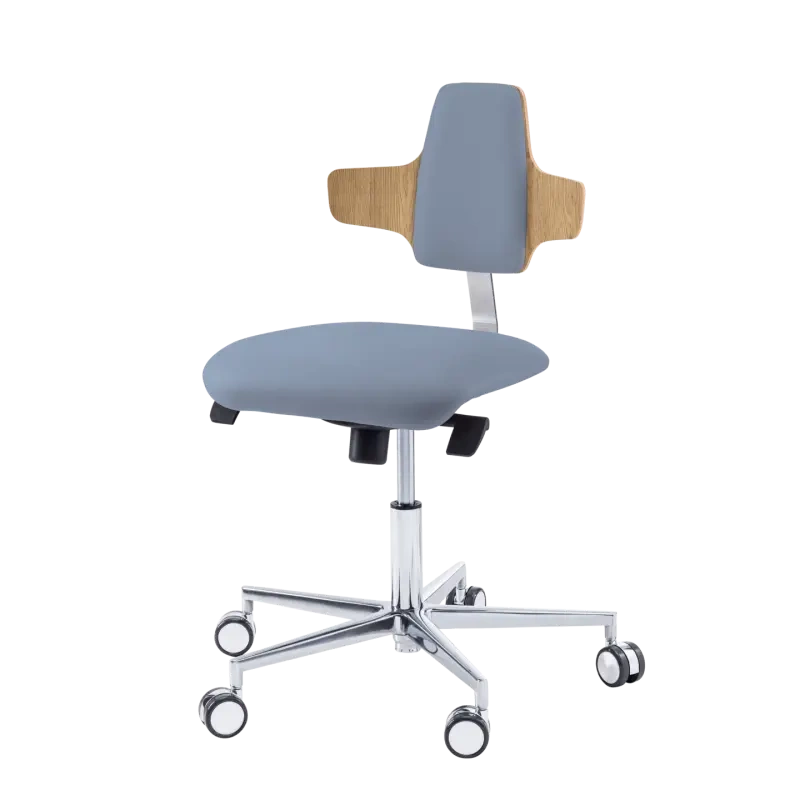Klasyczne krzesło do pracy z indywidualnie regulowanym i blokowanym oparciem jest wyposażone w solidną aluminiową podstawę i samohamowne kółka. Element oparcia ma kształt kapelusza napoleońskiego, połączonego z tapicerowaną częścią środkową. Skrzydła fotela są idealne do oparcia ramion i odciążenia pleców. Wysokiej jakości formowane drewno jest pokryte odporną na uderzenia i środki dezynfekujące powłoką CPL. Krzesło jest dostarczane jako zestaw. Dostępne z krótkim lub długim podnośnikiem gazowym.