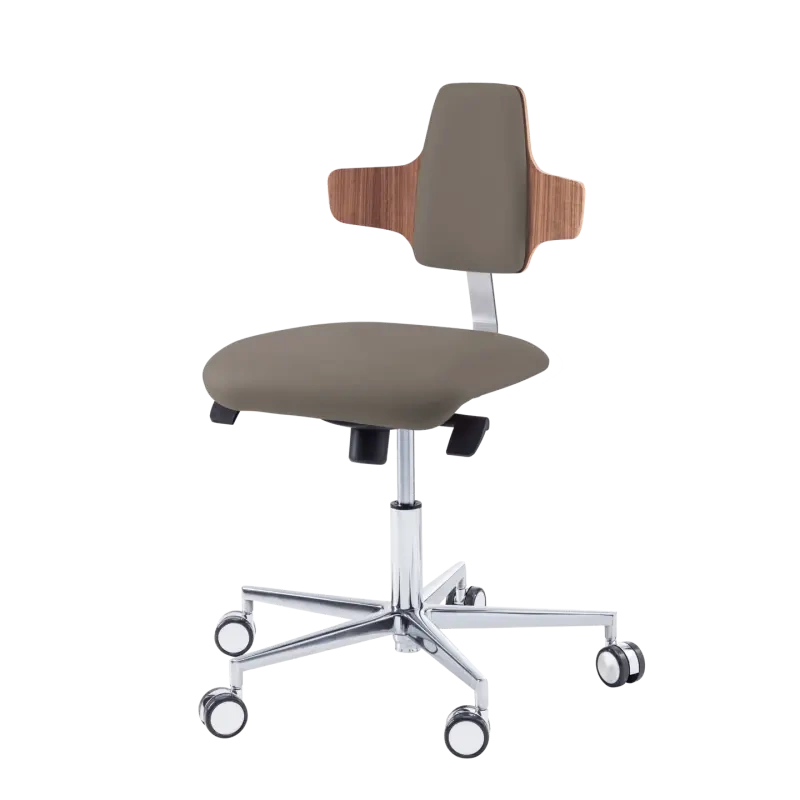 Klasyczne krzesło do pracy z indywidualnie regulowanym i blokowanym oparciem jest wyposażone w solidną aluminiową podstawę i samohamowne kółka. Element oparcia ma kształt kapelusza napoleońskiego, połączonego z tapicerowaną częścią środkową. Skrzydła fotela są idealne do oparcia ramion i odciążenia pleców. Wysokiej jakości formowane drewno jest pokryte odporną na uderzenia i środki dezynfekujące powłoką CPL. Krzesło jest dostarczane jako zestaw. Dostępne z krótkim lub długim podnośnikiem gazowym.