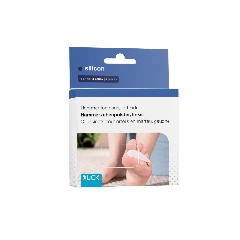 - Silikonowa podkładka RUCK® na lewą stronę pomaga szybko zmniejszyć ból i nacisk w okolicy palców przy palcach młotkowatych. Bardzo miękka, przyjazna dla skóry. Można ją myć ręcznie i używać wielokrotnie.