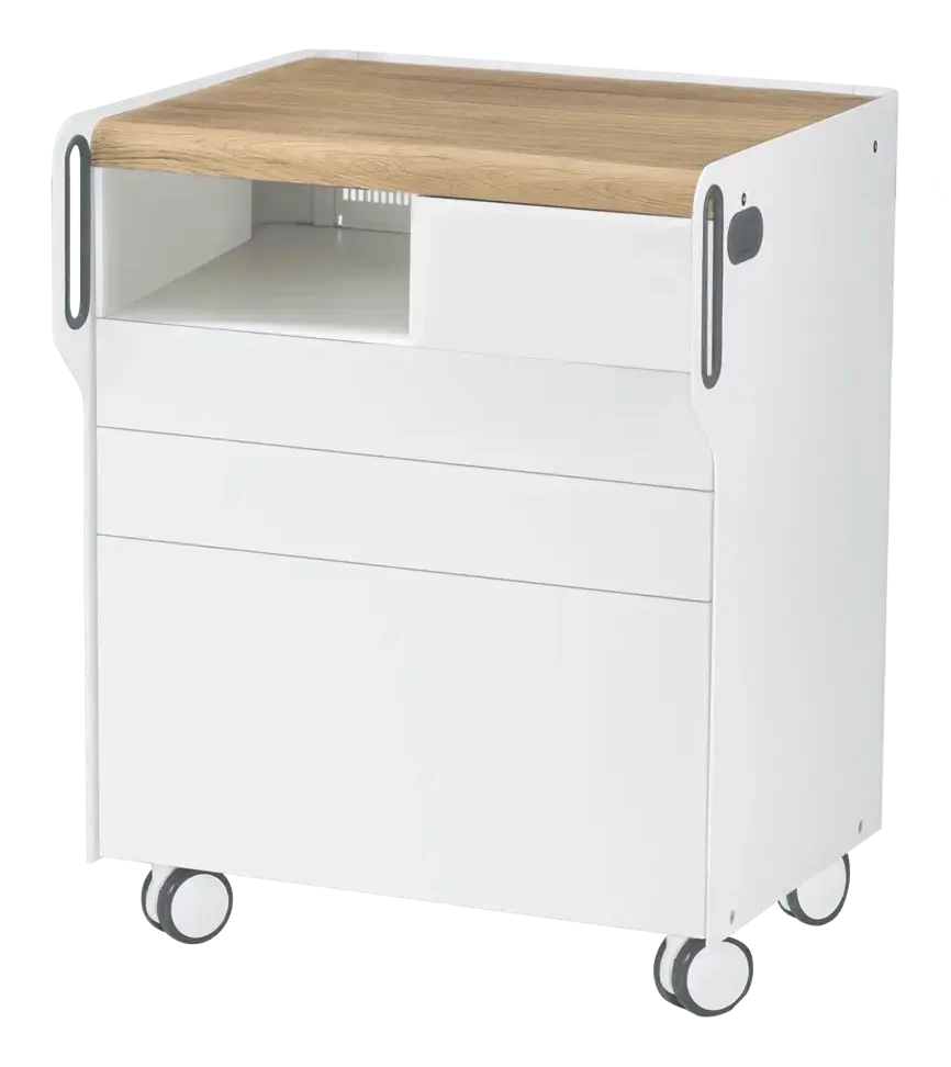 Boczne ścianki szafki z metalu, pokryte trwałą, białą powłoką proszkową i dostosowane do użycia z magnetycznymi akcesoriami RUCK®. Szuflady otwierane są przy pomocy funkcji Tip-On z Soft-Close, co zapewnia płynne i ciche zamykanie. Szafka posiada również wbudowaną listwę zasilającą, dostępną przez otwór magnetyczny z tyłu, co zwiększa komfort użytkowania w codziennej pracy.