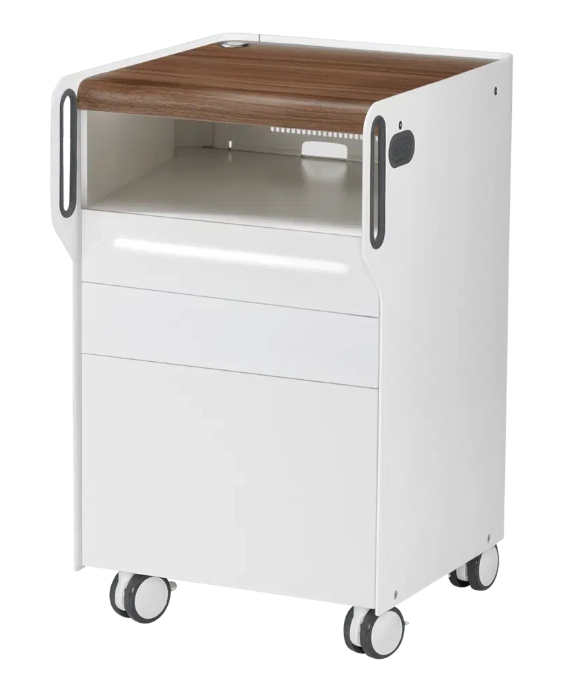 - Kompaktowa szafka podologiczna z wnęką na frezarkę, trzema szufladami z oświetleniem LED i blatem CPL. Idealna do mniejszych gabinetów. Mobilna, funkcjonalna, z miejscem na akcesoria magnetyczne.