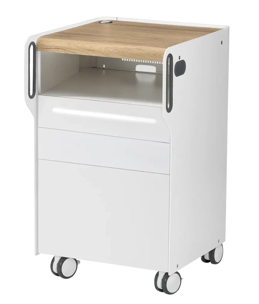 - Kompaktowa szafka podologiczna z wnęką na frezarkę, trzema szufladami z oświetleniem LED i blatem CPL. Idealna do mniejszych gabinetów. Mobilna, funkcjonalna, z miejscem na akcesoria magnetyczne.