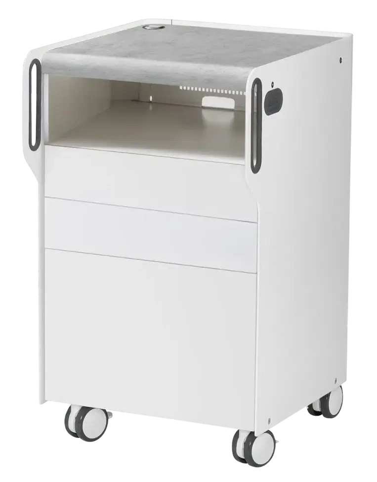RUCK® ROOM move S to funkcjonalna szafka zaprojektowana z myślą o nowoczesnych gabinetach podologicznych, gdzie liczy się oszczędność miejsca i wygodna organizacja pracy. Pomimo niewielkiego rozmiaru oferuje odpowiednią przestrzeń na frezarkę, akcesoria i przybory zabiegowe.