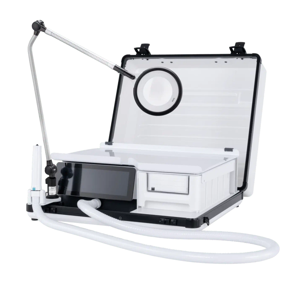 Uzupełnieniem zestawu jest mobilna lampa z lupą RUCK® Circle S, która gwarantuje doskonałe oświetlenie i powiększenie pola zabiegowego - idealna do pracy w różnych warunkach.